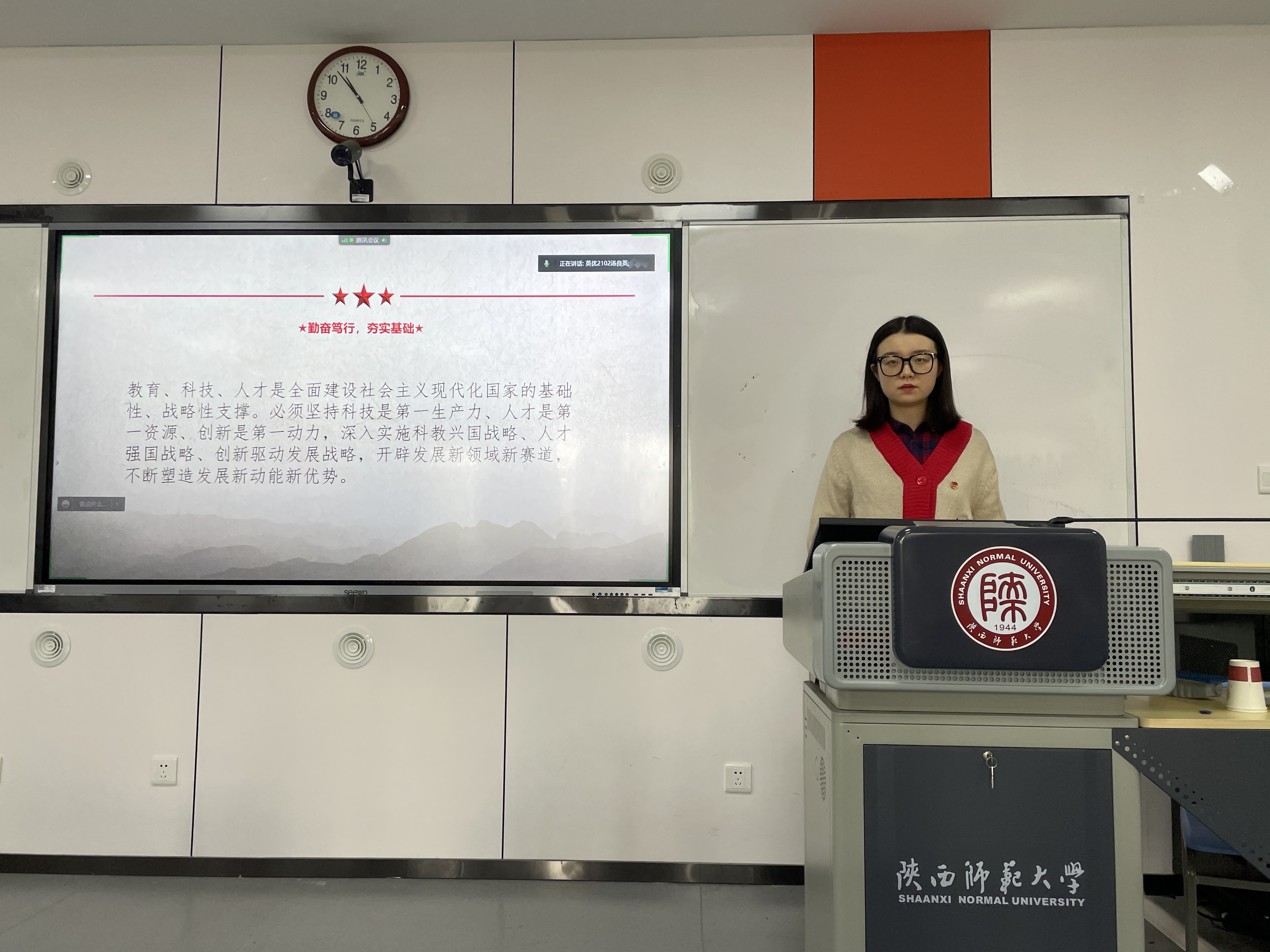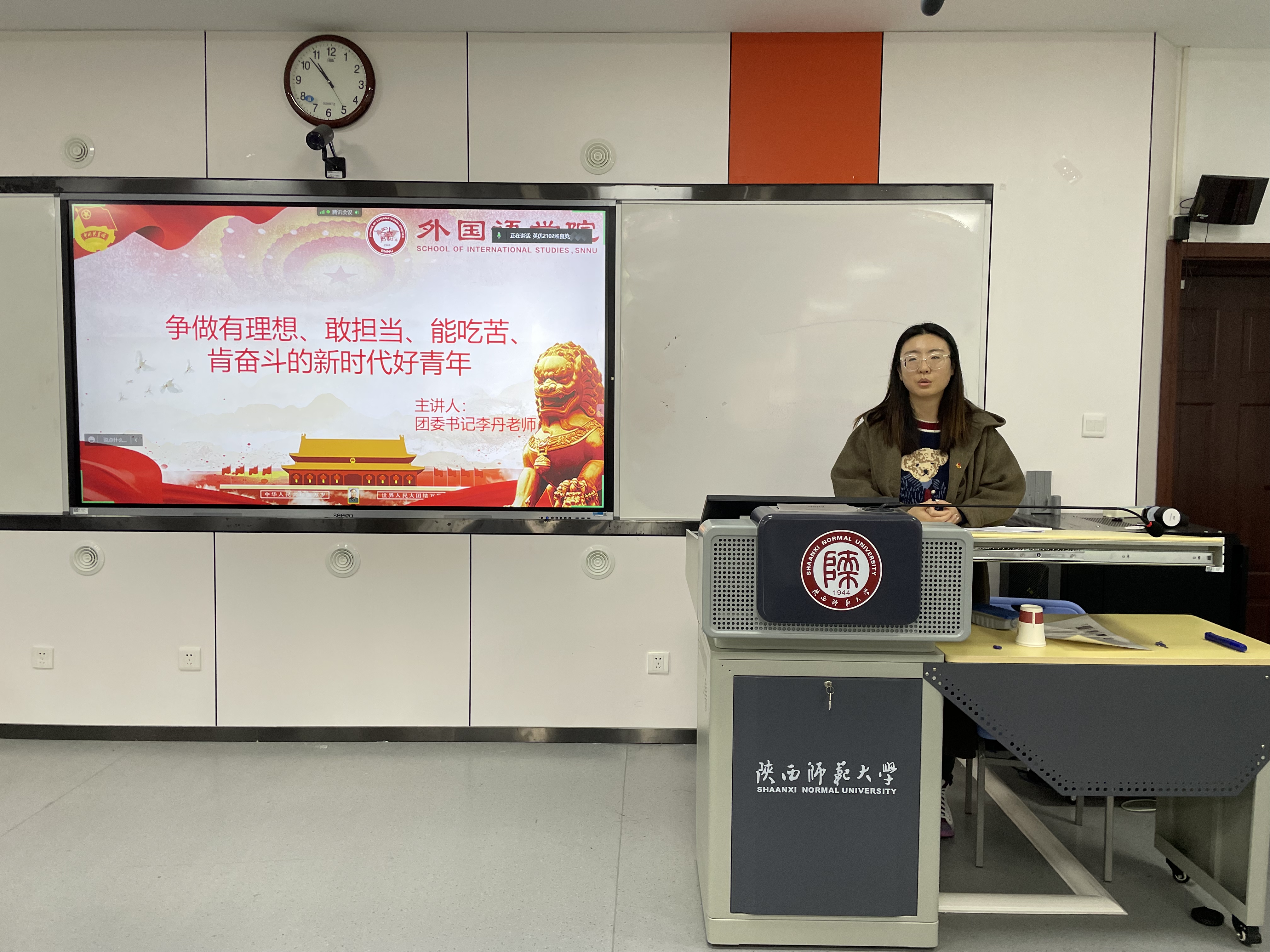 会议第一项由体育365官网团委书记李丹传达校团委相关文件精神并领学党的二十大精神。她激励同学们作为新时代的接班人,要踔厉奋发;作为外语人,要锤炼自己的专业能力,讲好中国故事;作为师范人,要发扬“西部红烛精神”,教育报国。最后,李丹对本月团日活动开展提出具体要求,鼓励团支书在团日活动设计上不断创新,采用同学们喜闻乐见、通俗易懂的形式,围绕思想引领、志愿服务、创新创业等主题,让团日活动更加有声有色,进一步把全院团员青年的思想统一到党的二十大精神上来,把力量凝聚到党的二十大确定的各项任务上来,为公司、公司共青团工作贡献力量。